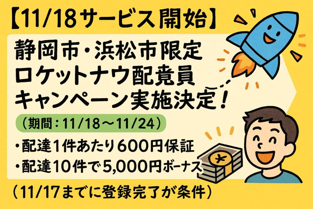 11月18日からサービス開始する、静岡市・浜松市エリアで配達員登録すると、お得なキャンペーンに参加できます。