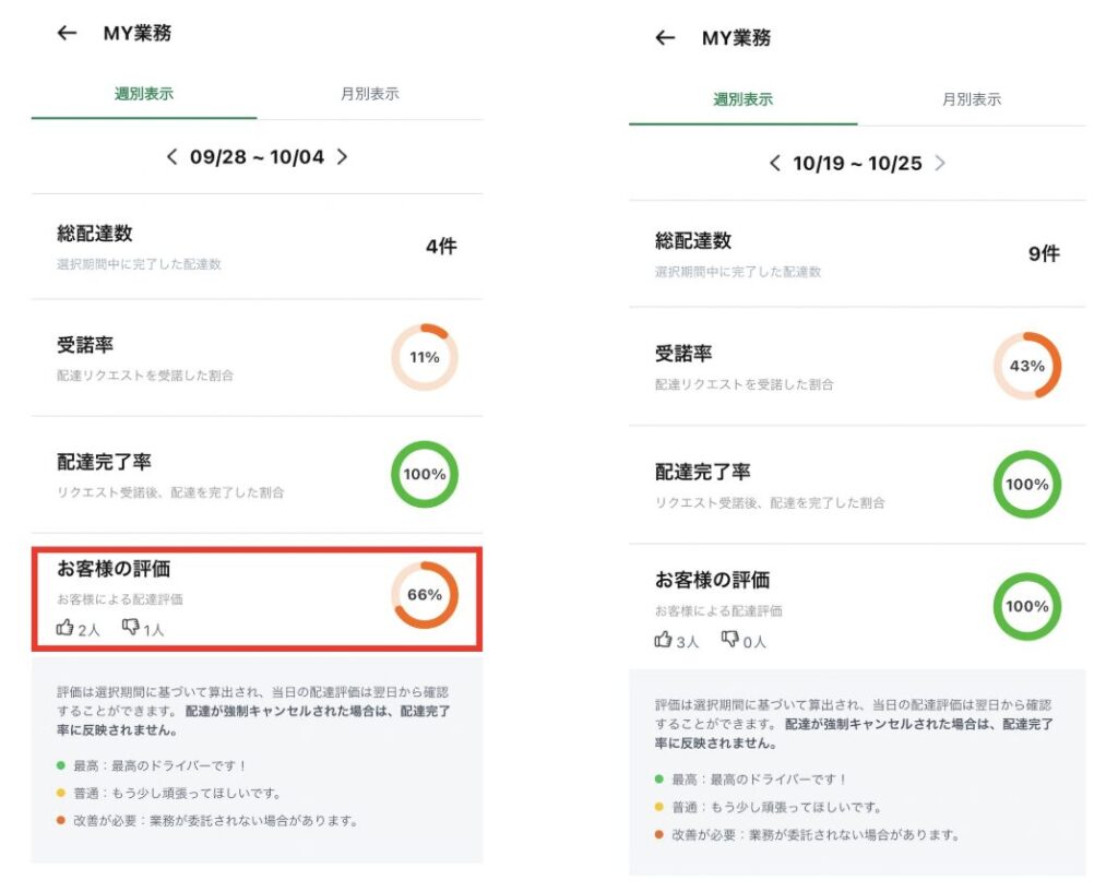 特に上の画像の左側の週は評価がオレンジ色になっていて、「改善が必要:業務が委託されない場合があります」と記載されています。