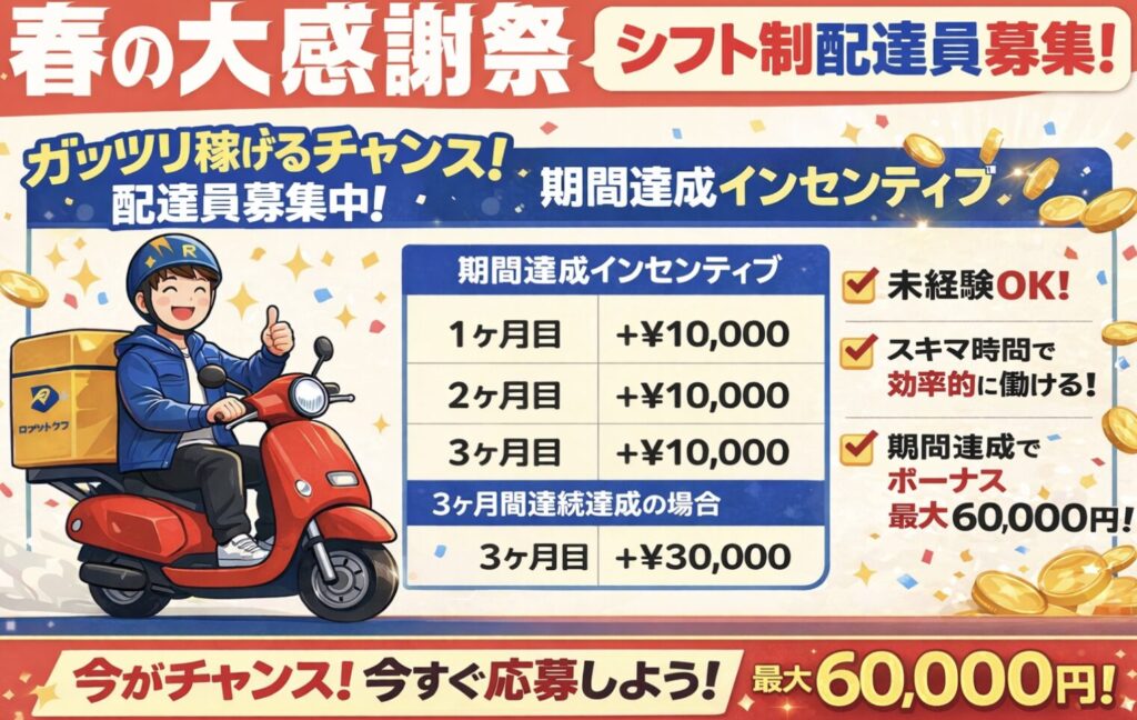 今では新規配達員に登録すると報酬がアップするキャンペーンも行っているので、ぜひ ホームページ を覗いてみてくださいね。